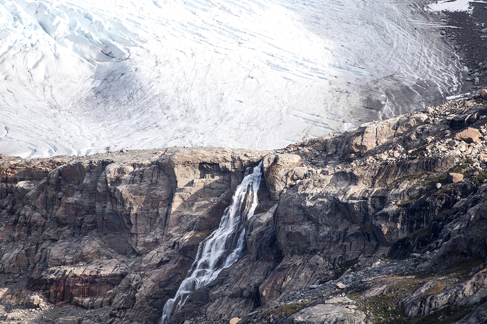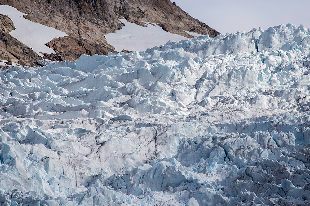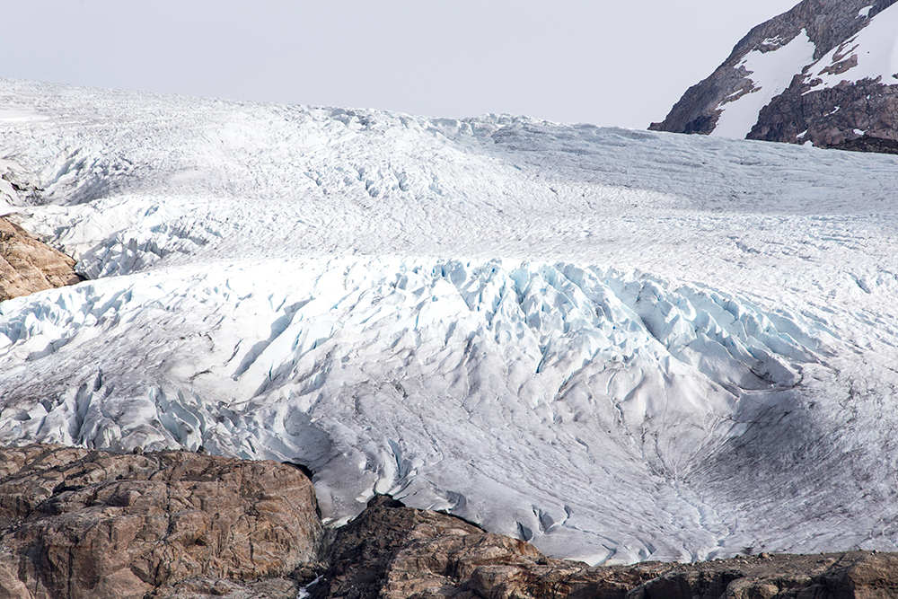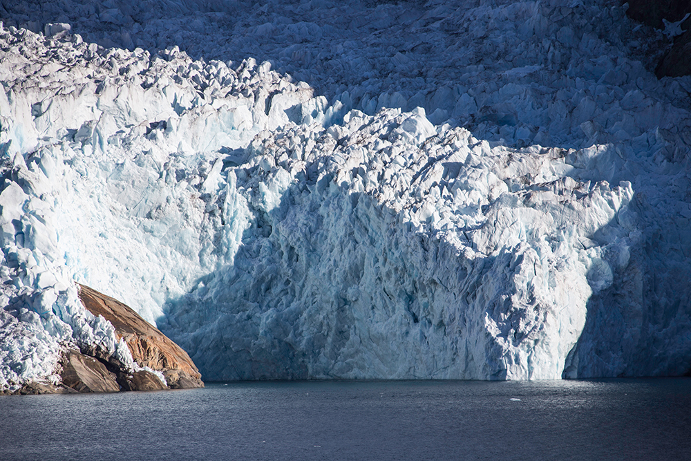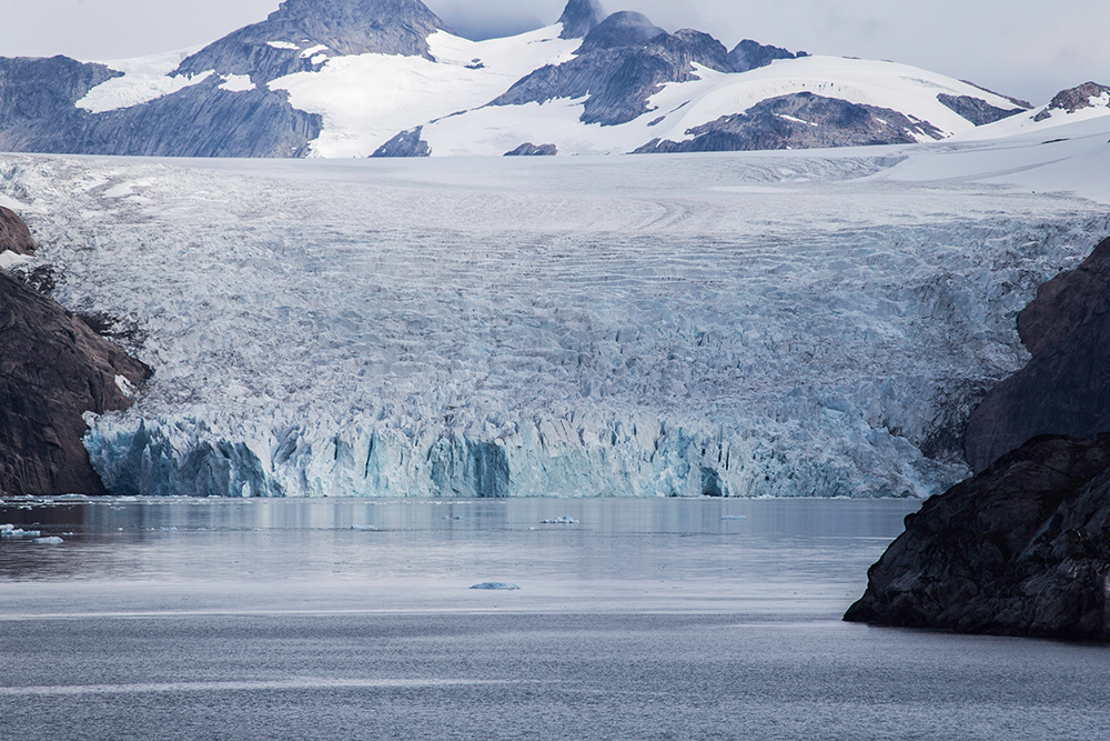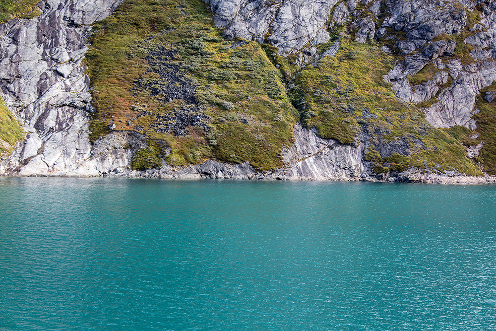 | ... auf diesem Foto ist im Wasser eine milchige Verfärbung zu erkennen. Das sind die mikroskopischen Sedimente, die vom Gletscher ins Meer gespült werden. Diese Sedimente sind auch das „Schleifpapier“ unter dem Eis, das dafür sorgt, das die Felsen geradezu „rund und glatt“ geschliffen sind, wenn der Gletscher wieder weg ist ... |