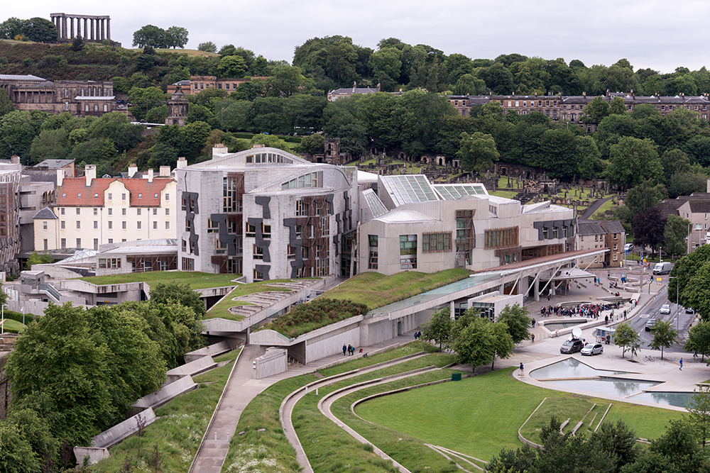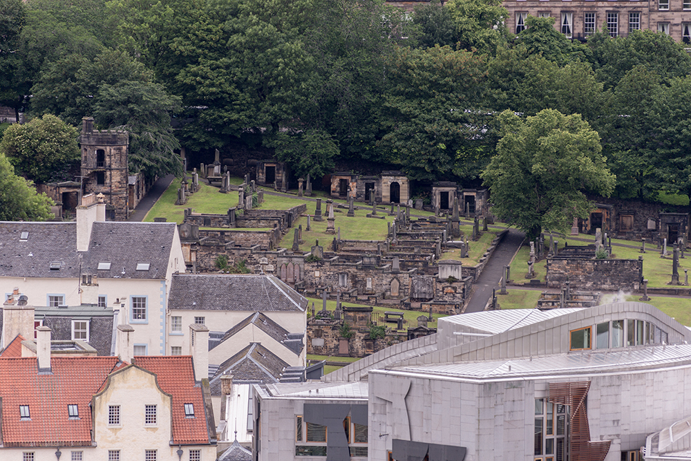 | ... Canongate Kirkyard und davor das Parlament ... |
