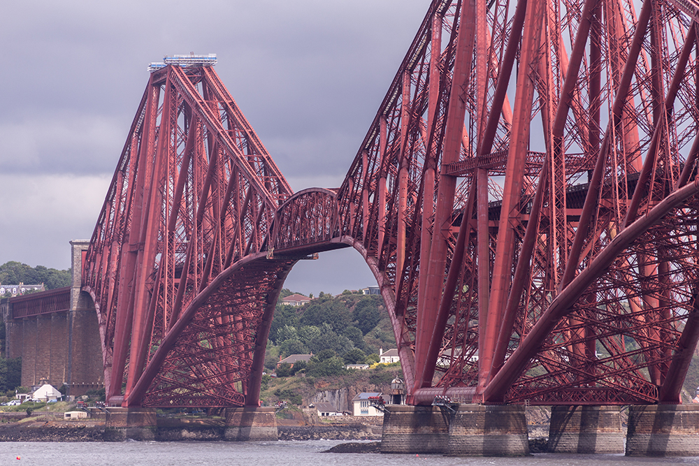 | ... die Forth Bridge ist eine zweigleisige Eisenbahnbrücke über den Firth of Forth, dem weit ins Land reichenden Mündungstrichter des Flusses Forth in Schottland und Weltkulturerbe. DieAusleg erbrücke hatte bei ihrer Eröffnung im Jahr 1890 die größte Spannweite aller Brücken weltweit. Diesen Rekord musste sie im Jahre 1919 an die Québec-Brücke abtreten. Sie gilt als die erste Brücke, die vollständig aus Stahl (im Gegensatz zu dem bis dahin verwendeten Schmiedeeisen) hergestellt wurde ... Quelle: https://de.wikipedia.org/wiki/Forth_Bridge |