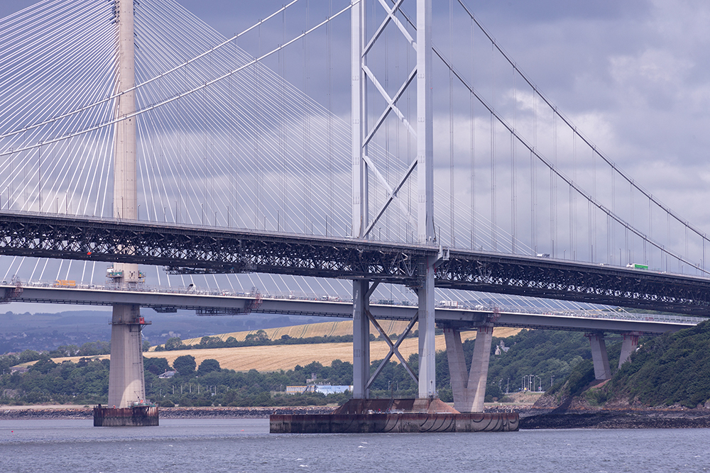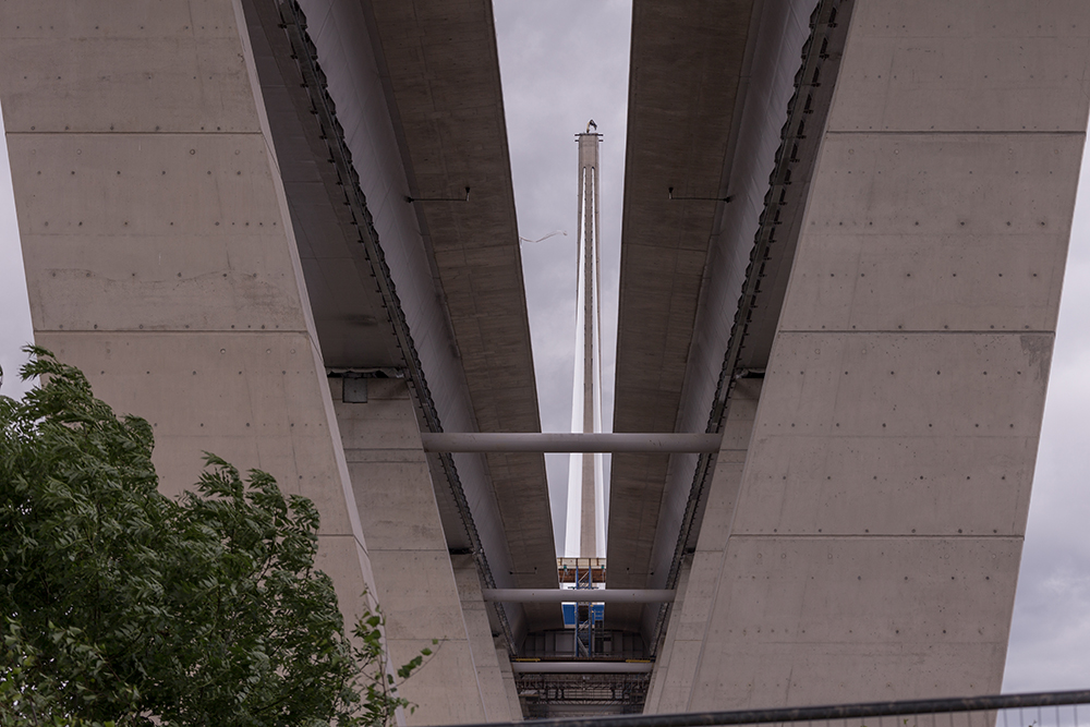 | ... Wartezeit vor einer Baustellenampel – direkt unter der neuen Queensferry Crossing mit einem tollen Blick auf den ersten Brückenpfeiler ... aus dieser, genau zentrierten, Perspektive ist die schicke Bespannung kaum zu erkennen ... |