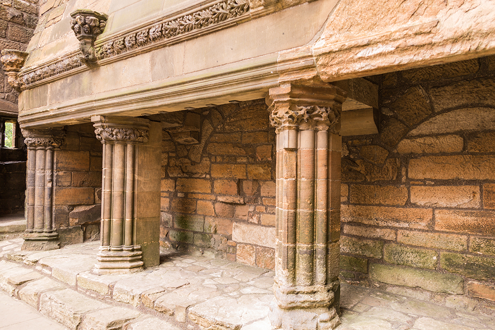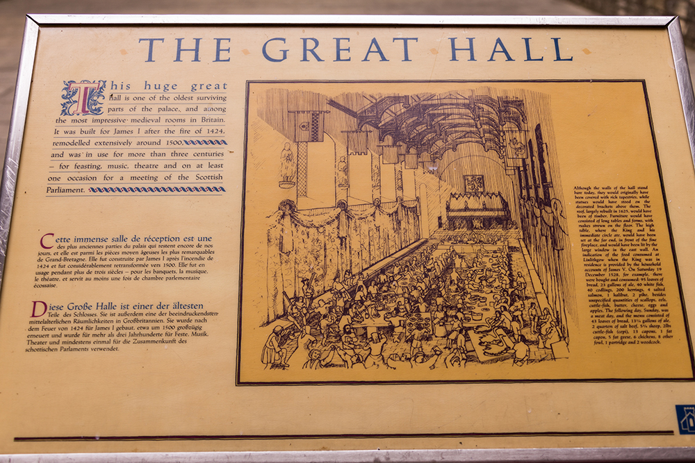 | ... der Hof wird durch einen mittig stehenden, achteckigen Steinbrunnen aus der Zeit der Renaissance beherrscht, von dem eine Kopie im Hof von Holyrood Palace steht. Er besteht aus drei pyramidenartig angeordneten Wasserbecken, die über Steinbögen miteinander verbunden sind, und ist durch aufwändig gestaltete Ornamente sowie Figuren auf allen Ecken dekoriert.Früher waren diese – wie alle anderen Statuen des Palasts auch – bunt bemalt. Bekrönt ist der Brunnen durch eine steinerne Krone. Ein zu sehendes Allianzwappen mit den Emblemen Schottlands und Frankreichs erinnert an die Hochzeit Jakobs V. mit der französischen Prinzessin Madeleine de Valois. Der Brunnen wurde möglicherweise schon 1746 durch die dort lagernden britischen Soldaten beschädigt, denn in den frühen 1800er Jahren wurden wohl erste Reparaturen vorgenommen ... |