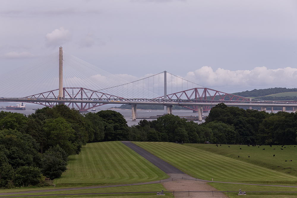 | ... im Vordergrund die 1964 eröffnete Forth Road Bridge und direkt dahinter die noch nicht eröffnete Queensferry Crossing ... |