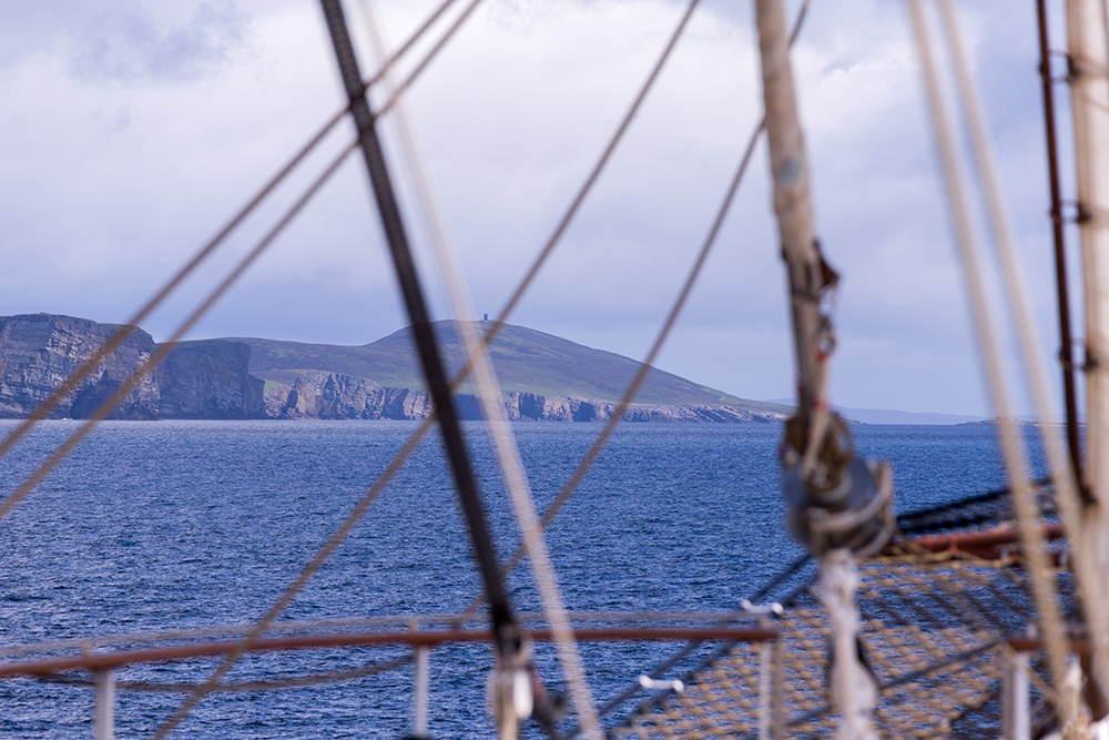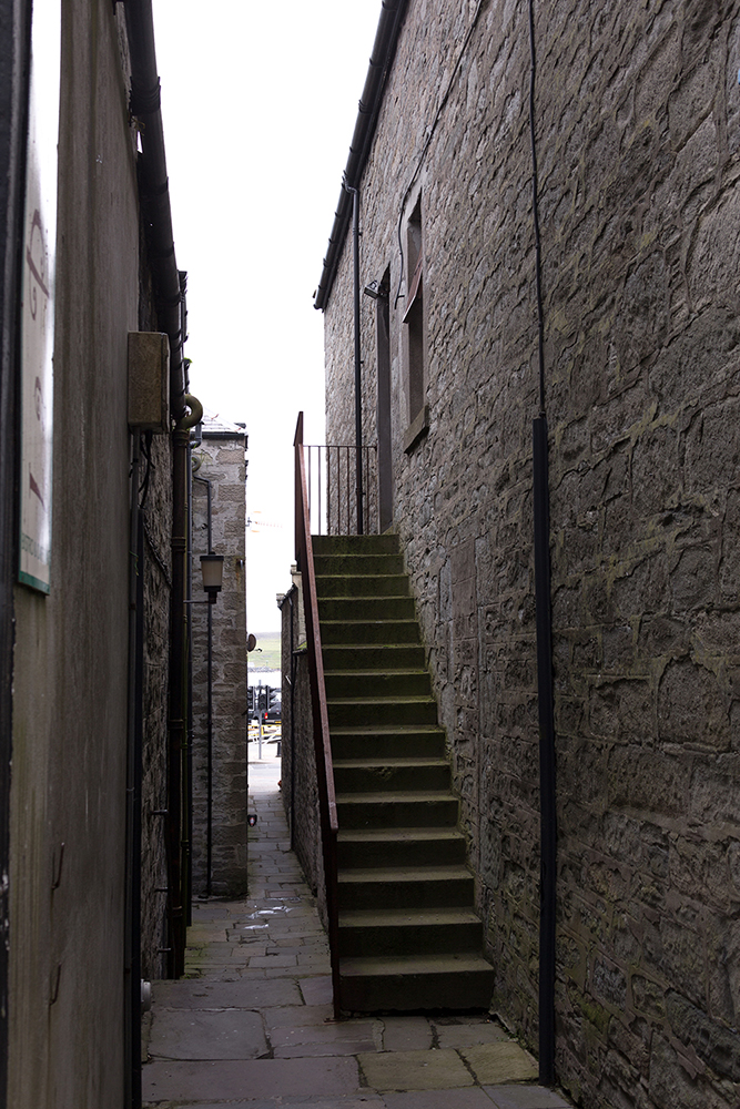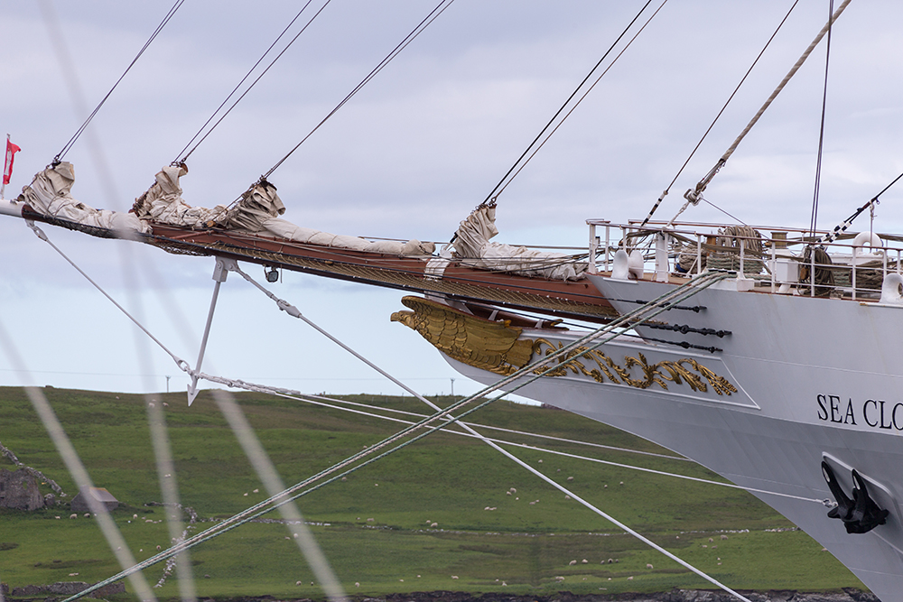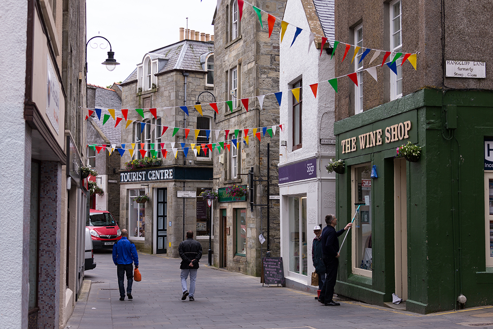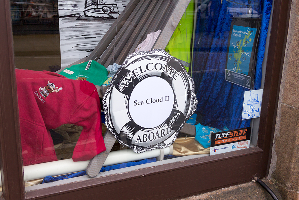 | ... überall, wo wir entlangschlendern schauen irgendwo die Masten der Sea Cloud II über die Dächer von Lerwick hinweg ... |