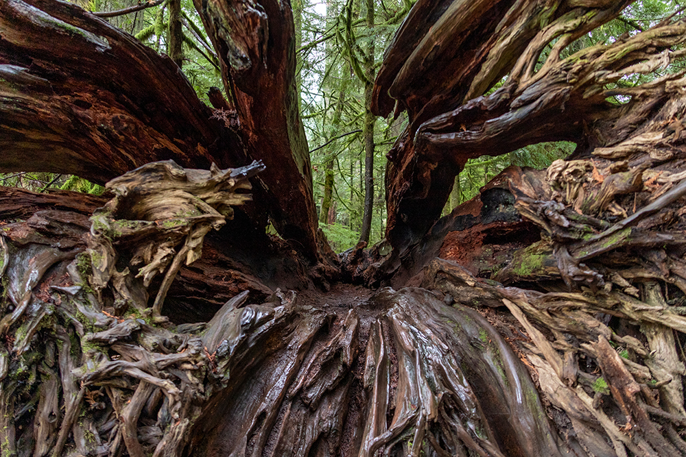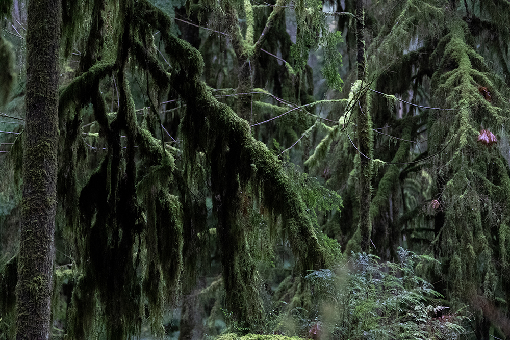 ... auch die Dunkelheit weit unterhalb der Kronen ist „gespenstischer“ und weniger farbenfroh als in einem Redwood Wald ...